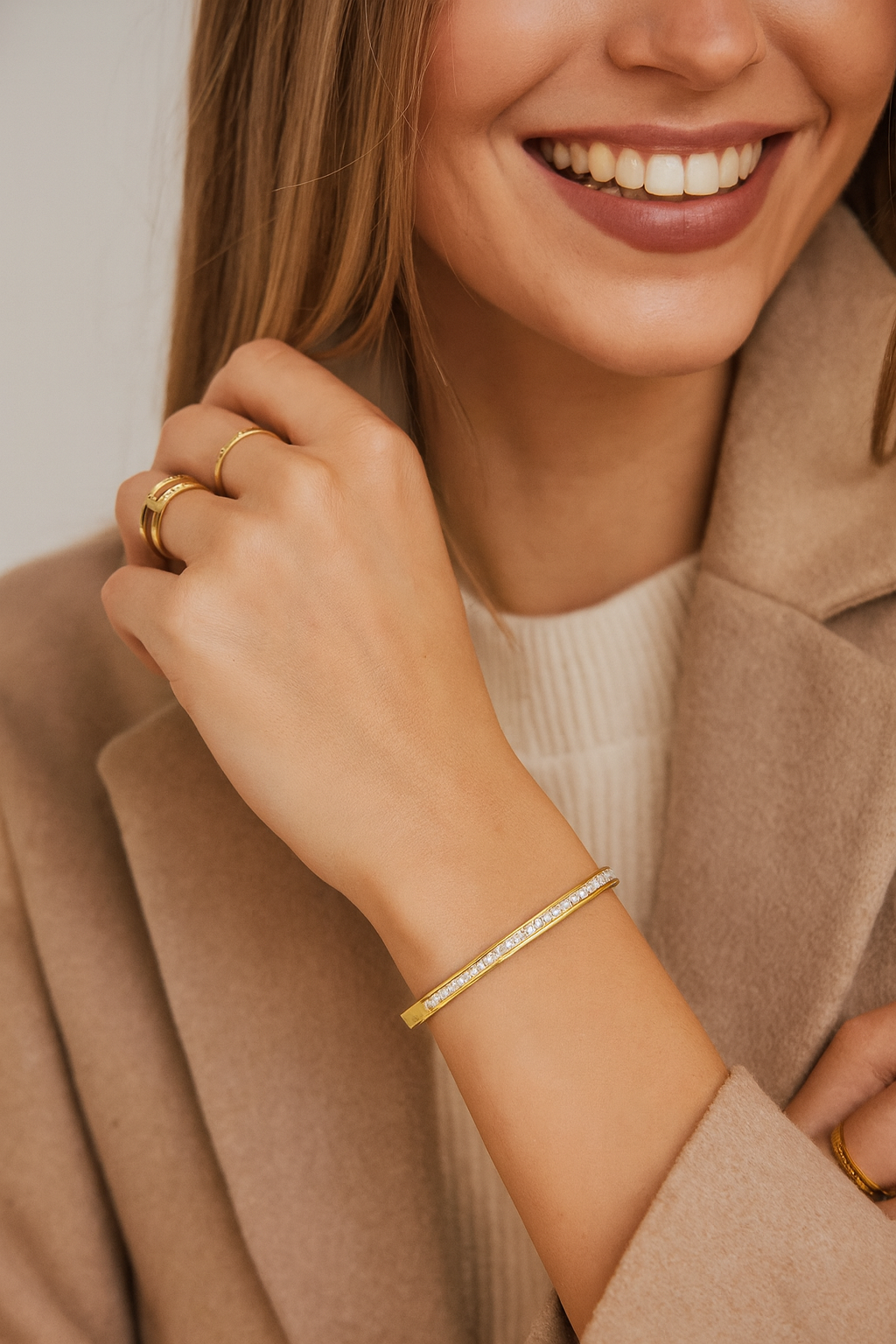 Add timeless sophistication to your style with this luxurious golden bangle, beautifully adorned with sparkling crystal accents. Its sleek and minimalist design makes it the perfect statement piece for both everyday wear and elegant occasions.
