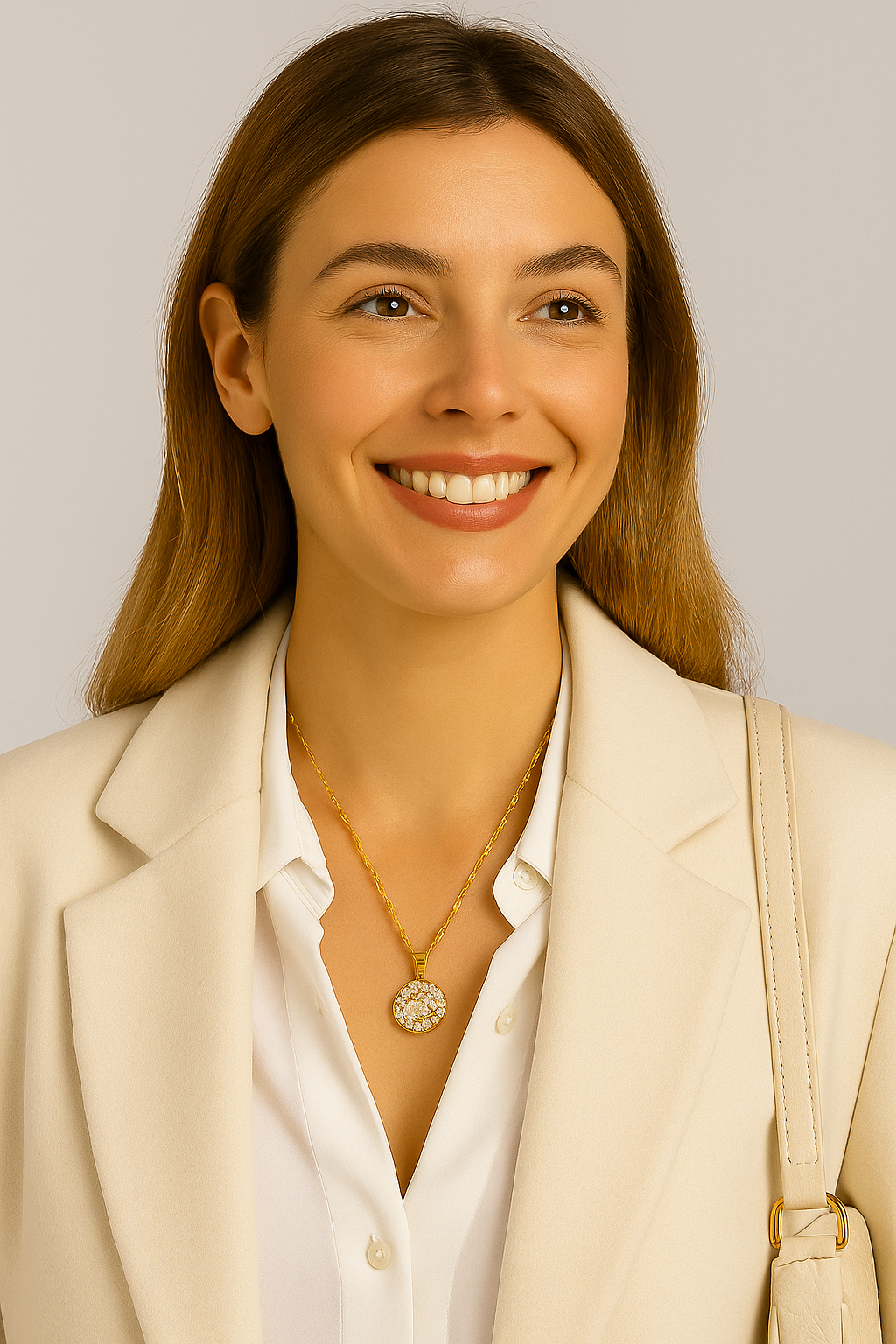 - Pendant: Circular medallion fully set with sparkling crystals