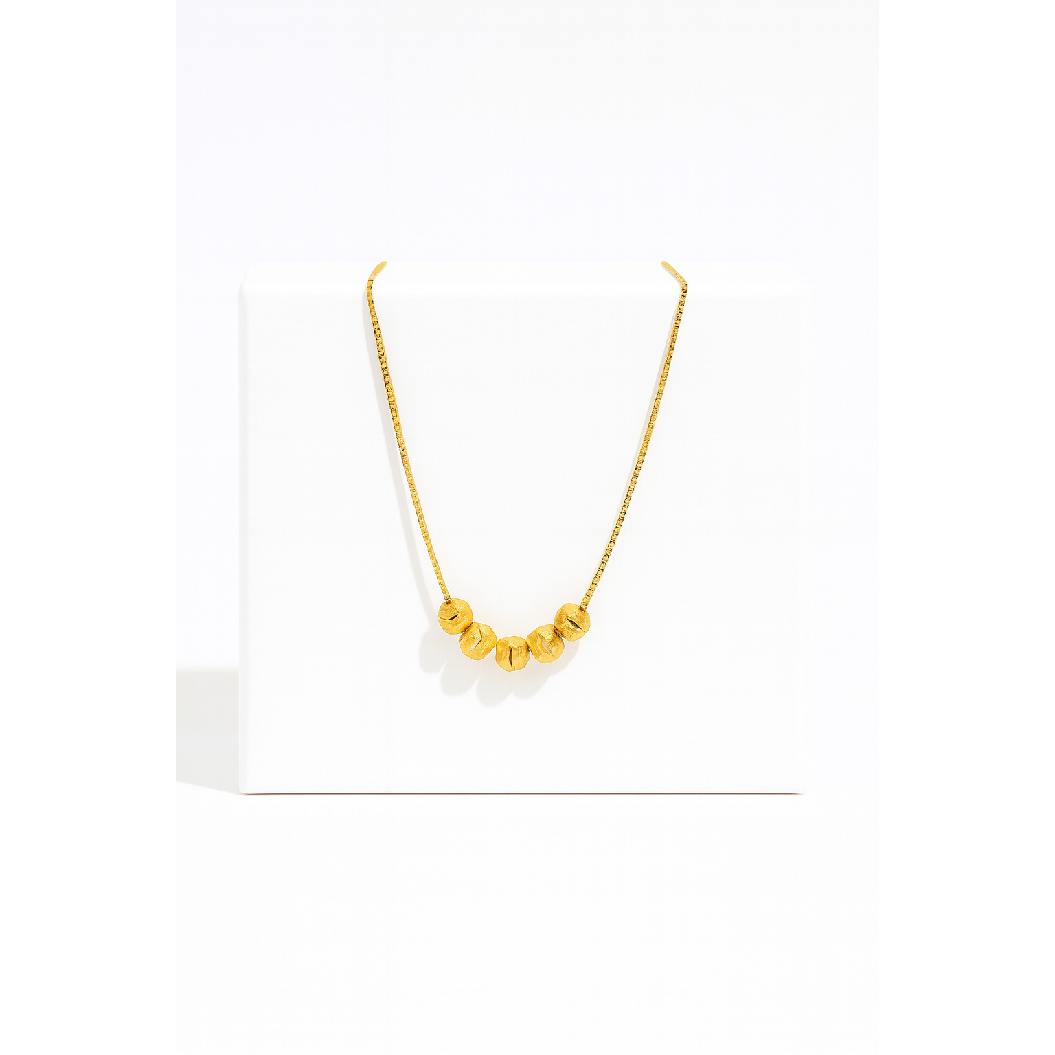 - Design: Five golden beads with a glossy finish for a contemporary look